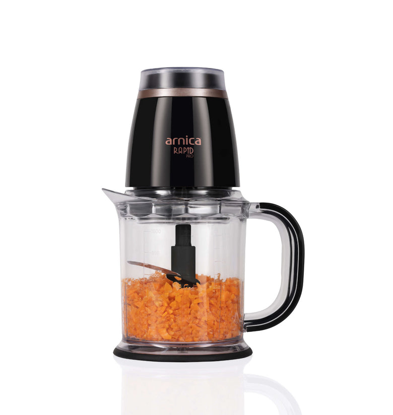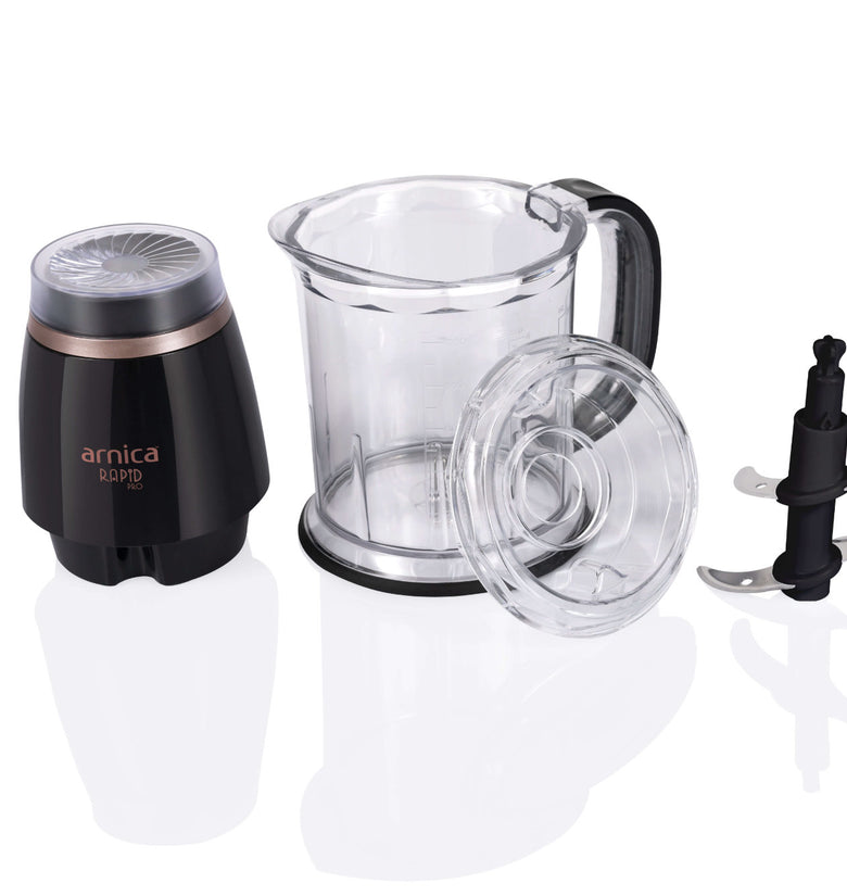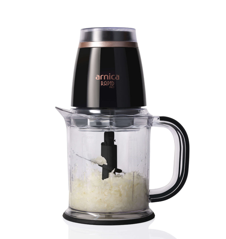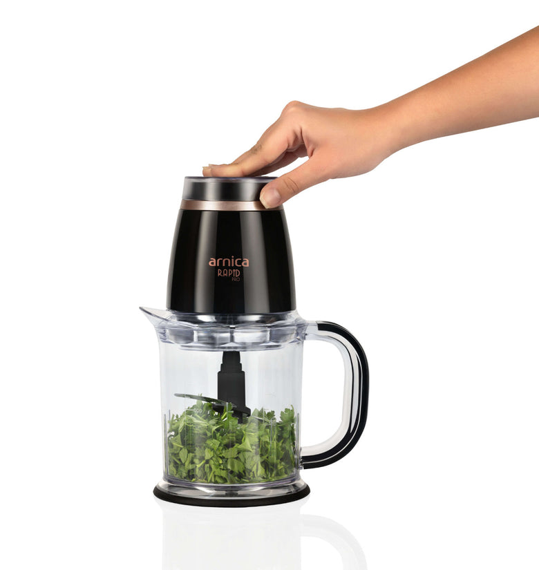 Der arnica Rapid Pro Zerkleinerer erhält durch die Farbkombination schwarz und rosé eine besondere Eleganz.
