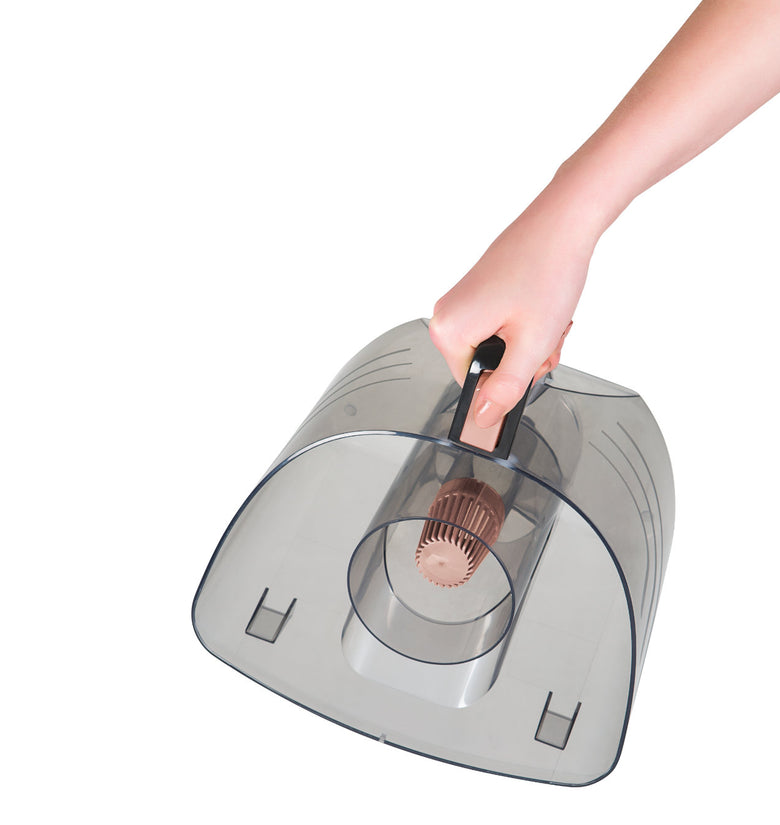 Dank dem innovativen Griff des Behälters kann der Staub in nur kurzer Zeit und wenigen Schritten entsorgt werden.