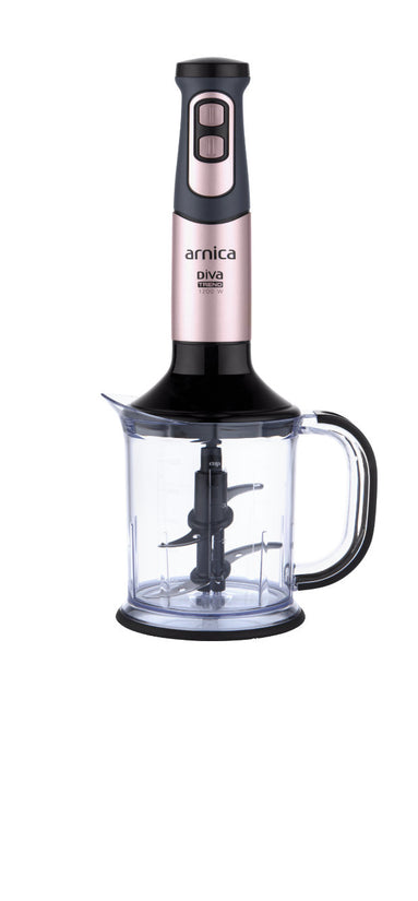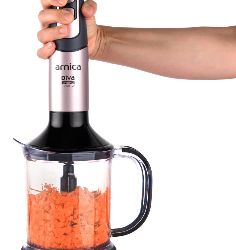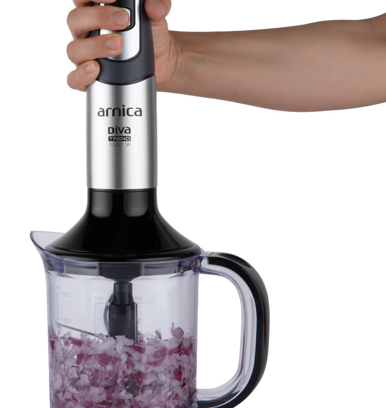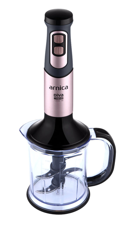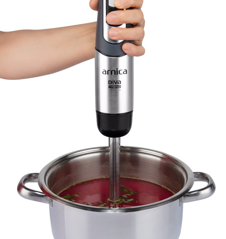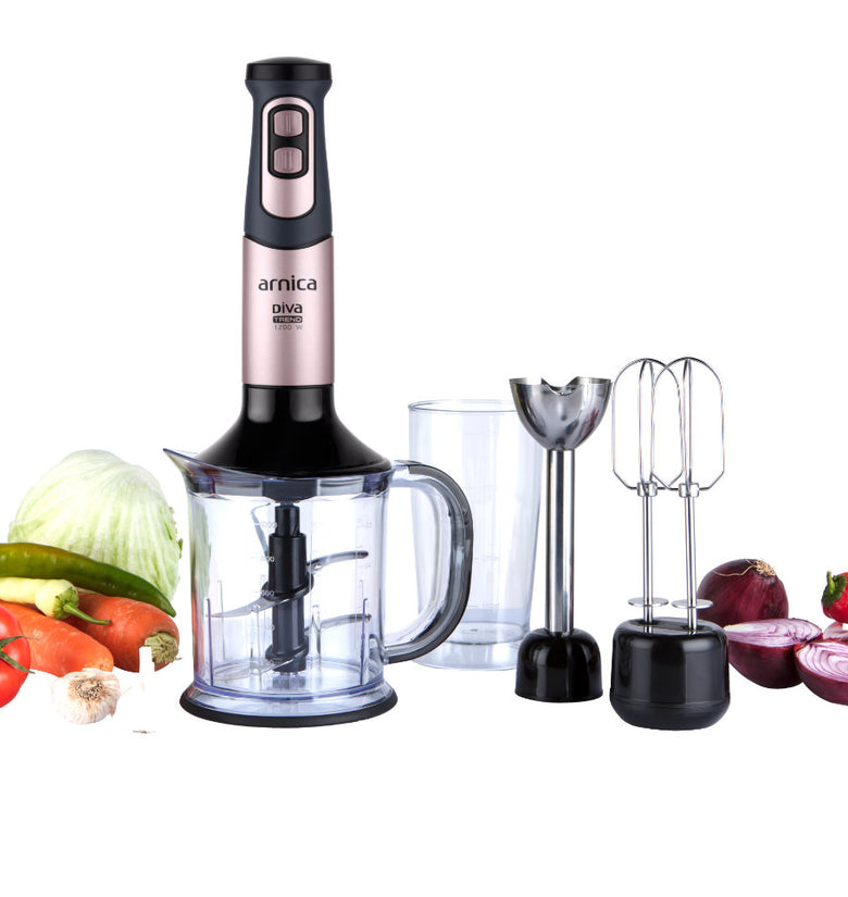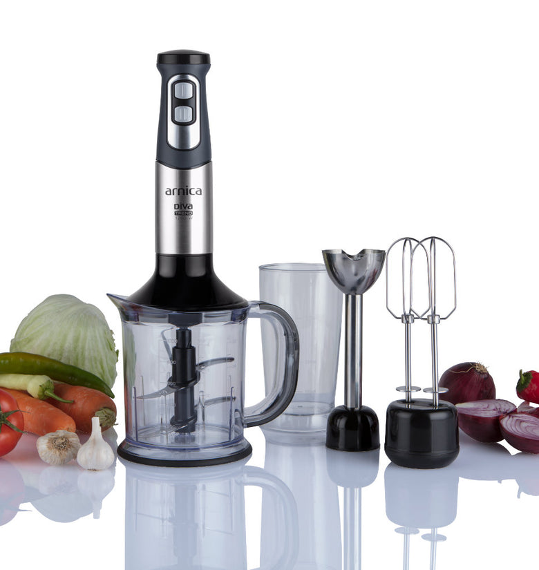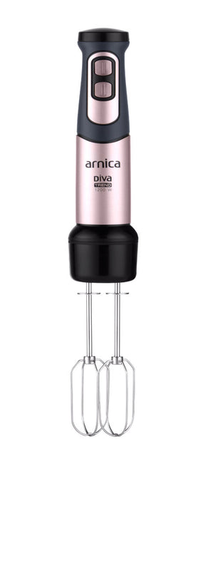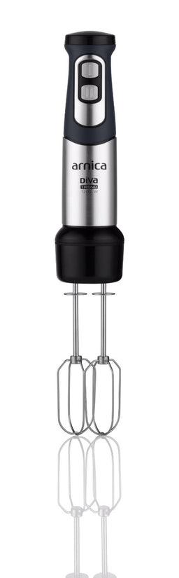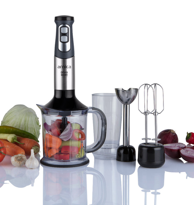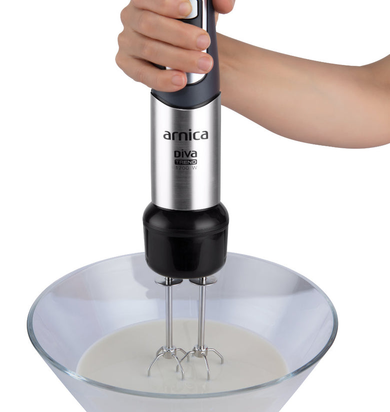 arnica Diva Trend Set wird mit einem Edelstahlmixer, einem Schneebesen und einem Pürierstab geliefert.