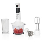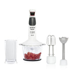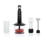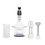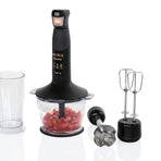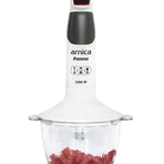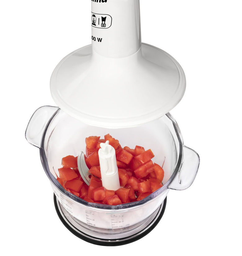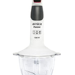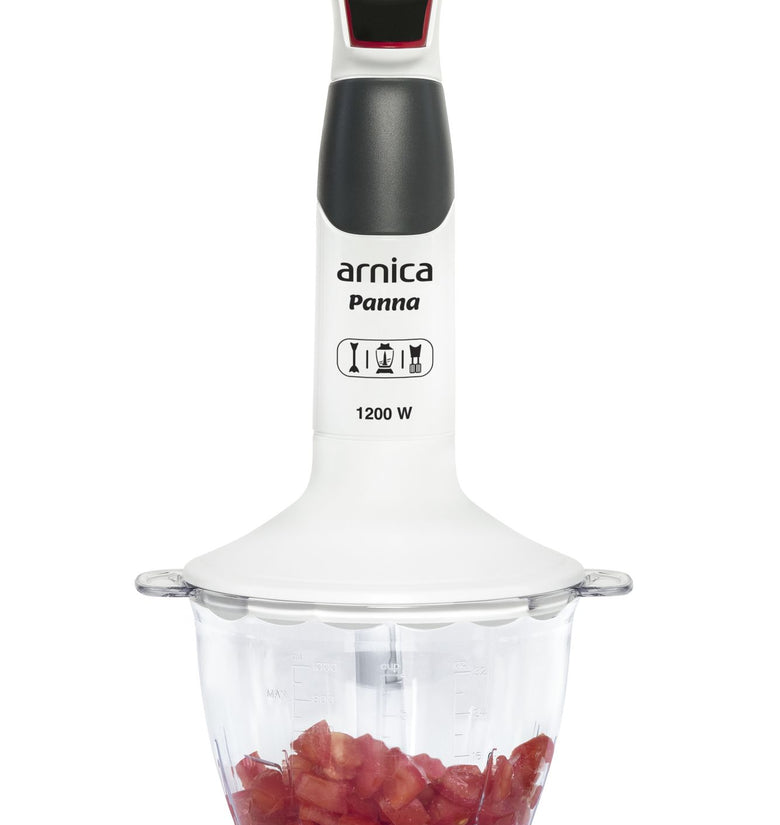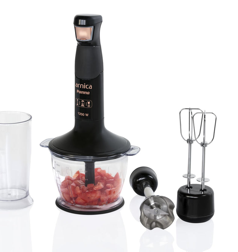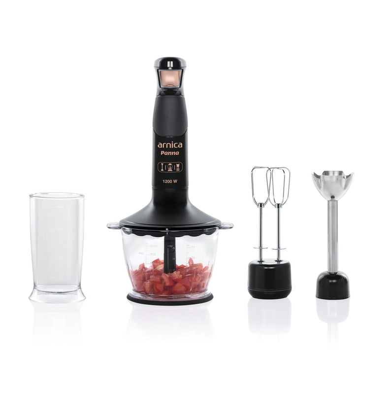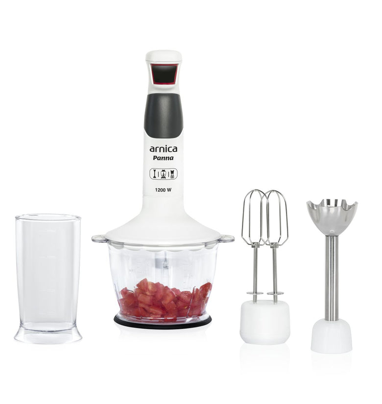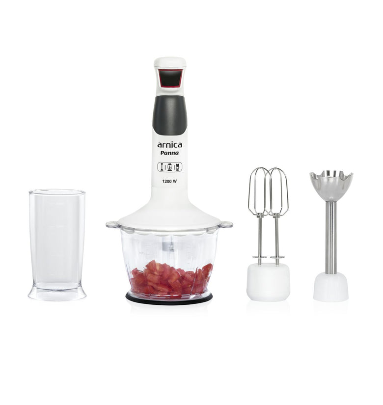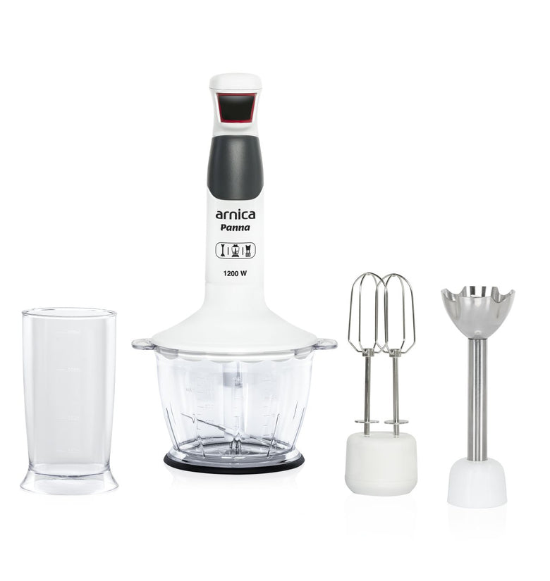 Das Panna Stabmixer-Set ist mit seinem ergonomischen Design und seiner sicheren Verwendung der beste Helfer in Ihrer Küche. Mit seiner starken Leistung von 1200 Watt können mit den Edelstahlklingen auch die härtesten Gemüse- und Obstsorten problemlos zerkleinert werden. Das Set hat eine Zerkleinerungskapazität von 1,3 l und zeichnet sich durch einen 600 ml Messbecher aus. Mit 1200 W Leistung und Turbobetrieb können Sie das Produkt auf die effizienteste Weise nutzen. Das Panna Stabmixer-Set ist handlich durch seinen sicheren Griff. Es verfügt über ein Easytouch-System, welches das Arbeiten erleichtert. Das Produkt besteht aus Spülmaschinenfestem Zubehör, welches durch leichtes Drehen gelöst werden kann.