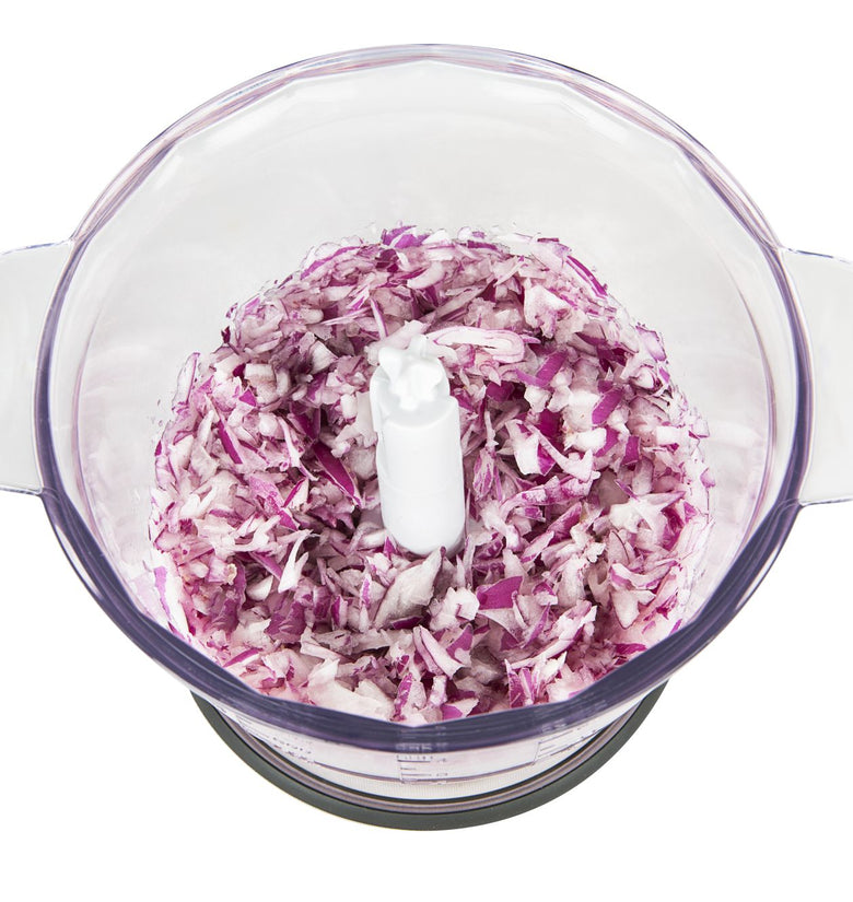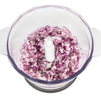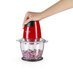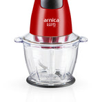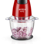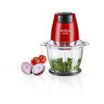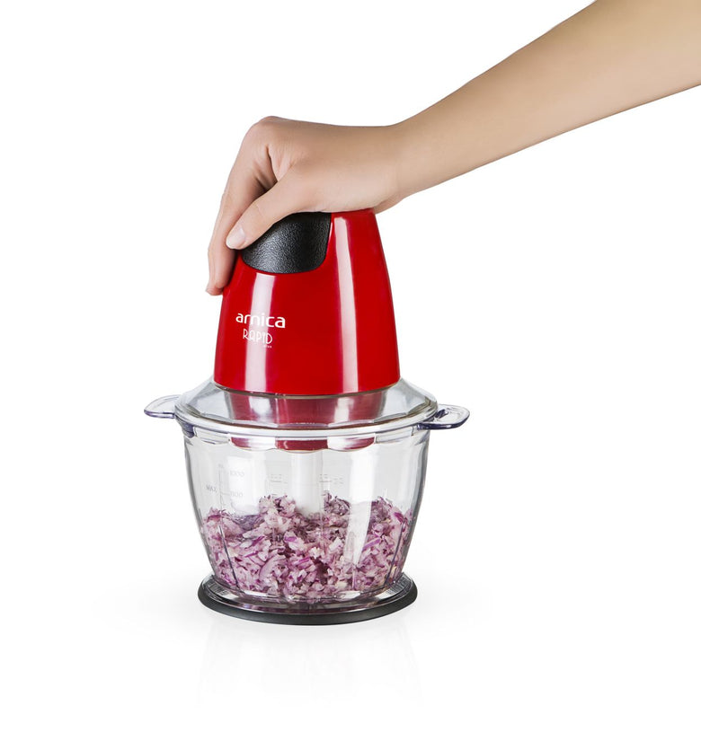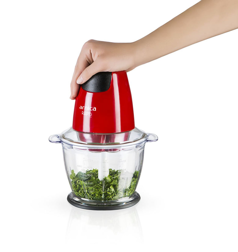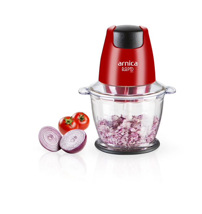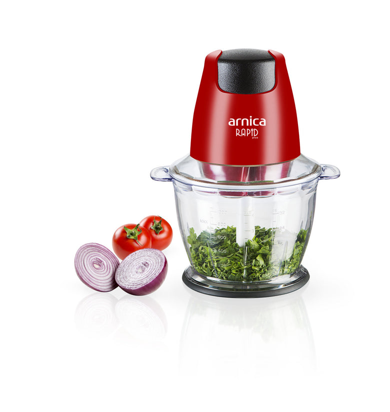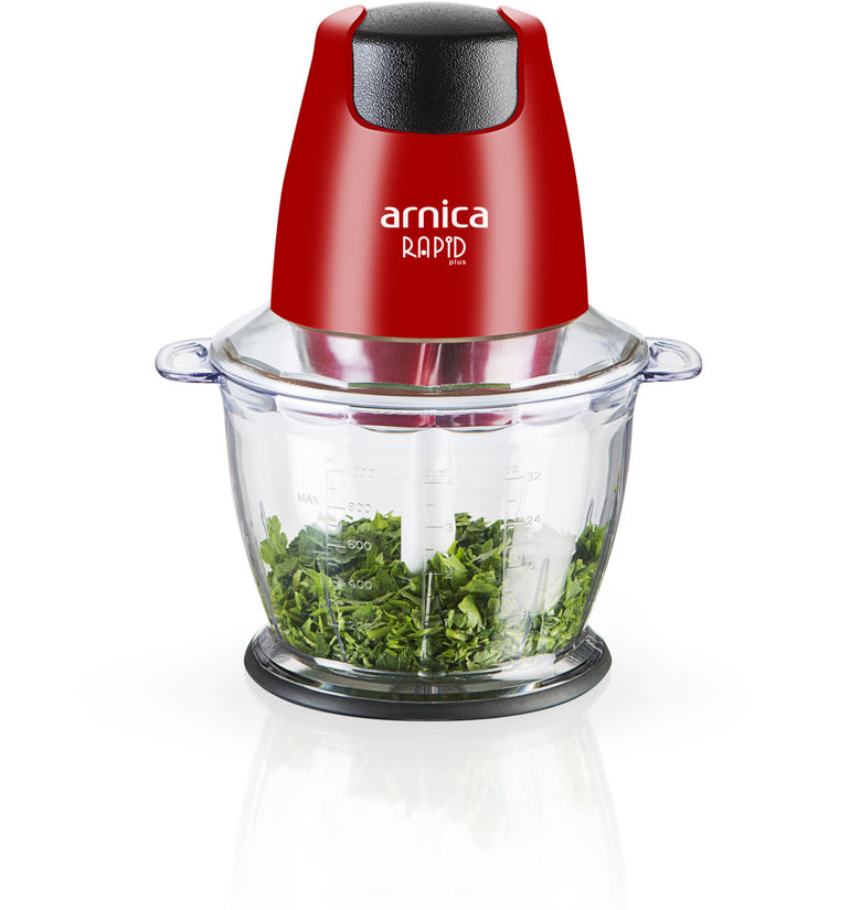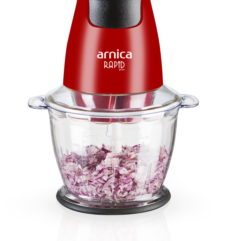 Der arnica Rapid Plus in Rot zerkleinert mit dem 1300-ml großem und einem stabilen Behälter problemlos auch hartes Gemüse in großen Mengen. Die Motorleistung beträgt 500 Watt.